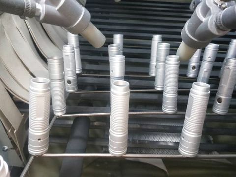 Parts moves on a belt through a blasting chamber for surface treatment.